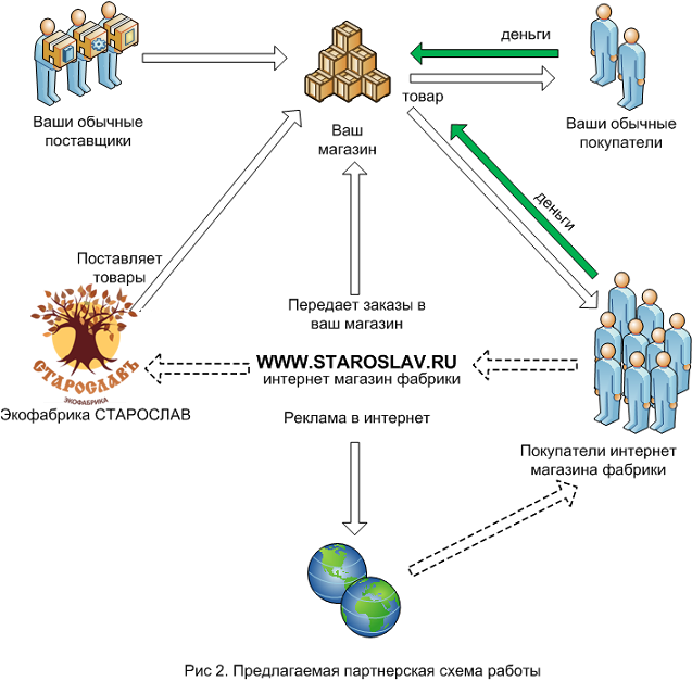 Предлагается привлечь в Ваш магазин новых покупателей из интернет. На следующем рисунке показано как работает новая схема торговли. Мир уходит в интернет и такая схема торговли через несколько лет станет классической.Суть в том, что интернет-магазин нашей фабрики ежедневно посещает несколько тысяч человек. Мы можем высылать посылки с заказами почтой, но можем и перенаправлять заказы клиентов в магазины, по месту жительства заказчика, где присутствует продукция нашего производства. Это удобно всем участникам сделки - заказчик быстро получает свой заказ, Вы получаете нового(!) покупателя, фабрика разгружает свой отдел логистики.